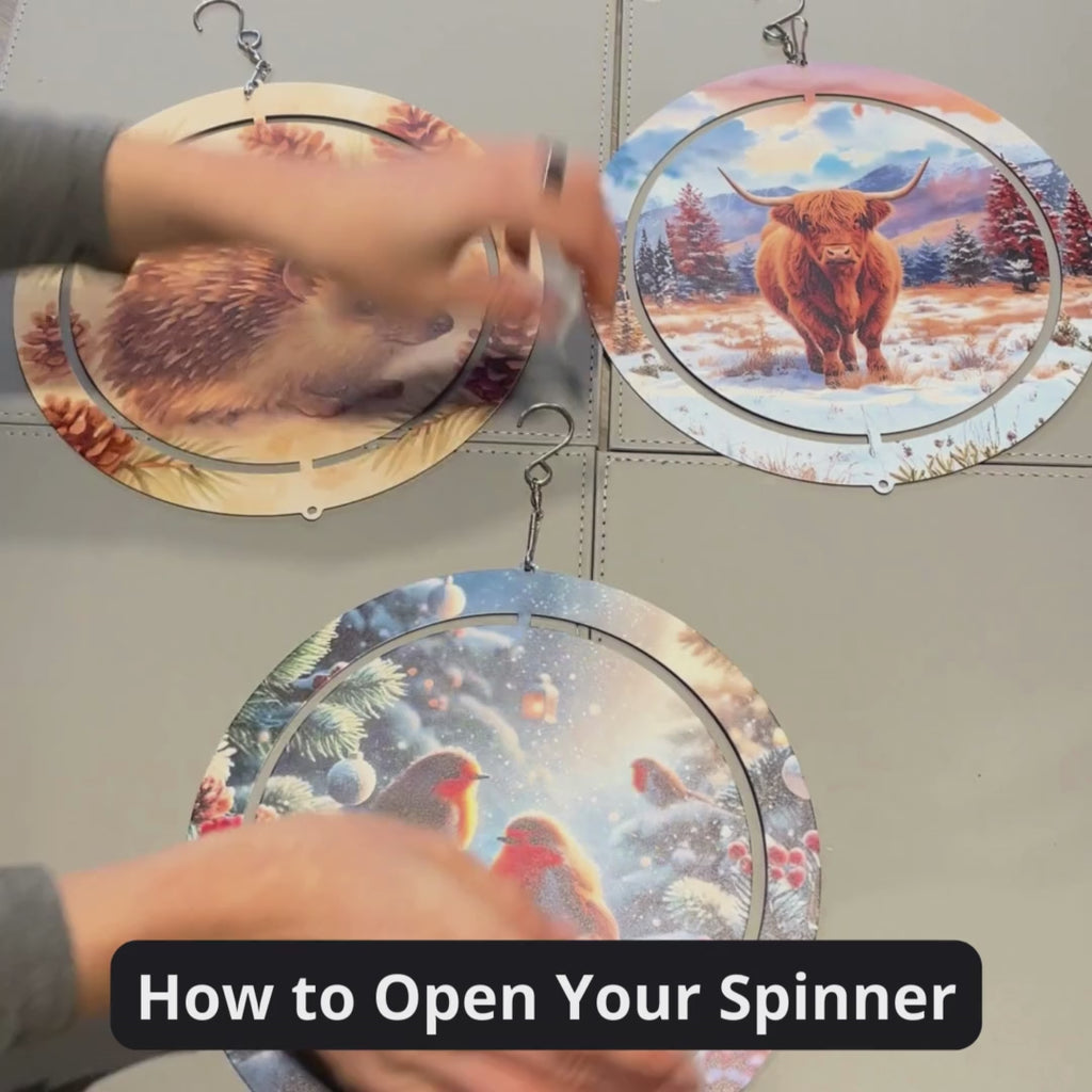 Bring a touch of the Highlands to any garden with this beautiful hanging orbit spinner featuring a Highland Cow standing proudly against a snowy mountain backdrop. Designed to spin smoothly at a fixed 90° angle, it adds gentle movement to any outdoor space 🐮