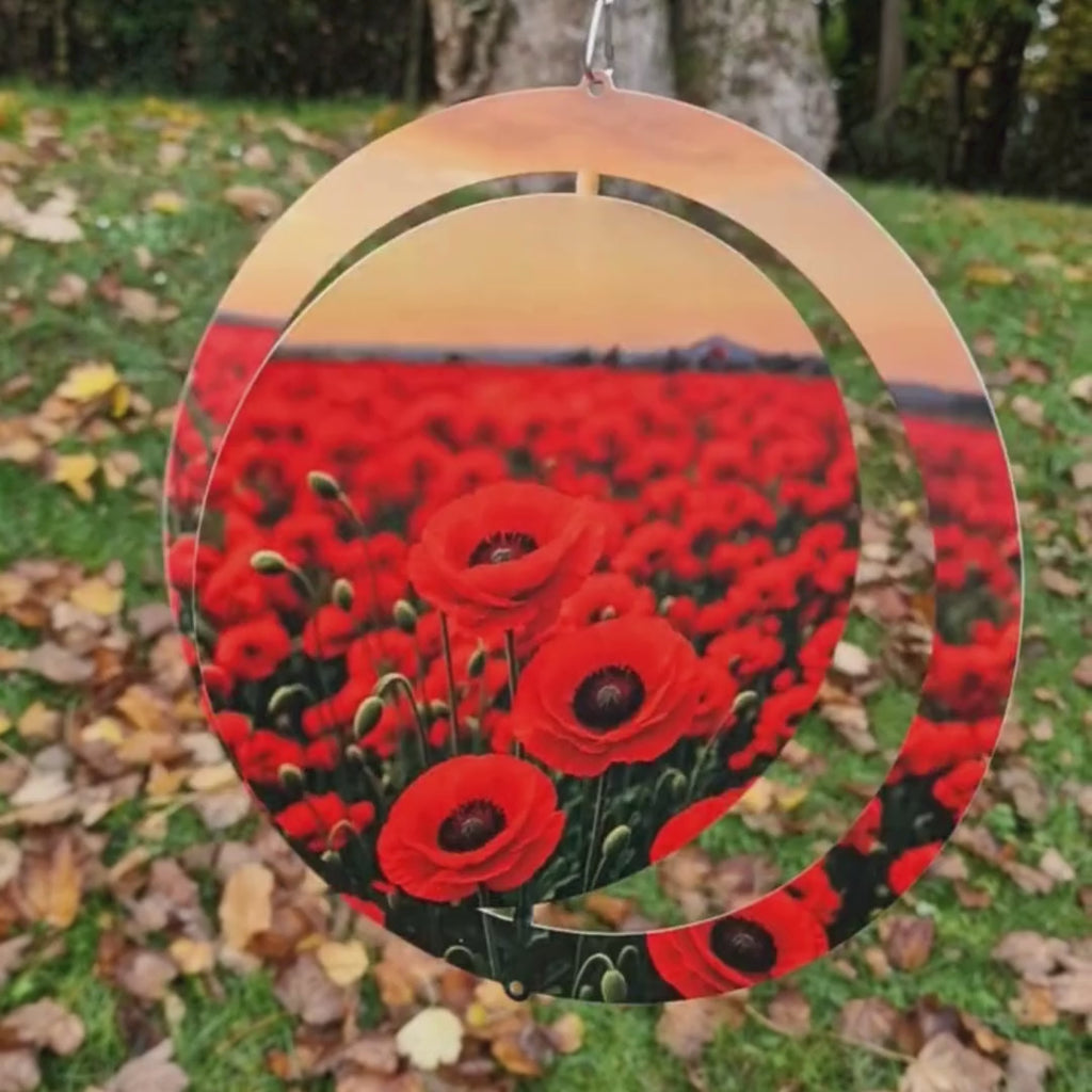 Bring a sense of peace and remembrance to your garden with this elegant Poppy Orbit Spinner. Featuring a vibrant field of red poppies set against a soft sunset backdrop, it spins at a fixed 90° angle, making it a beautiful tribute piece and a striking addition to any garden or outdoor space 🌹