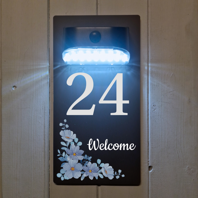 Welcome Blue Floral Motion Sensor Solar House Number Sign