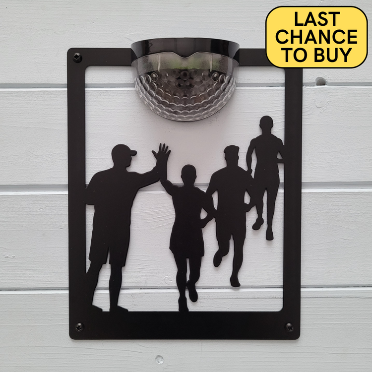 Celebrate your passion for running with our bespoke solar light featuring a group of runners, including one giving a high-five. This charming design adds a vibrant touch to your outdoor space, perfectly reflecting your active lifestyle and enthusiasm for the sport 🏃♀️🏃