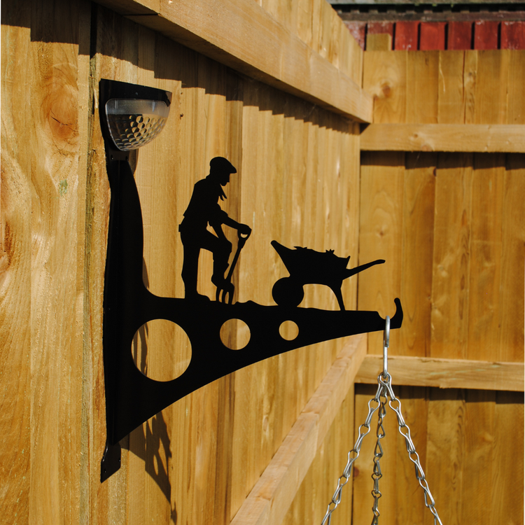 A bespoke steel bracket of a man doing his gardening. The bracket also includes a powerful solar-powered LED light - a perfect addition to light up the garden.