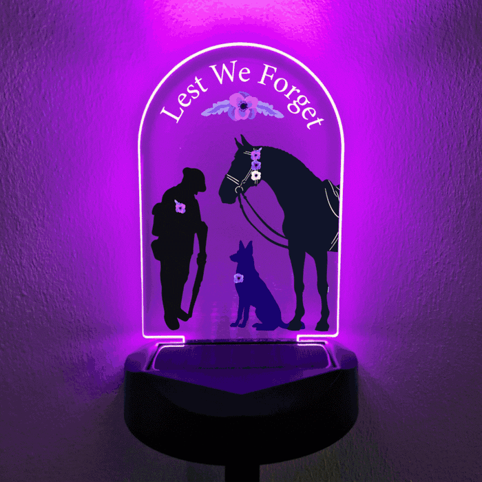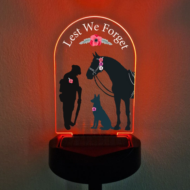 Honour and remember with this beautifully crafted 'Lest We Forget' Solar Light Stake, featuring a poignant silhouette of a soldier, horse, and loyal dog adorned with poppies.