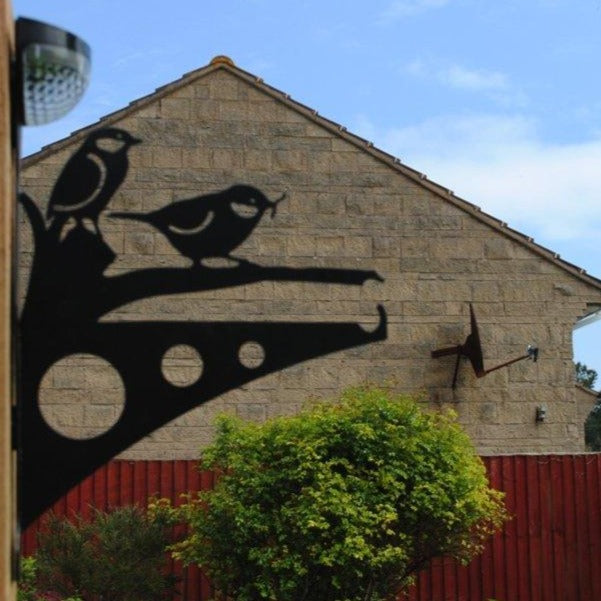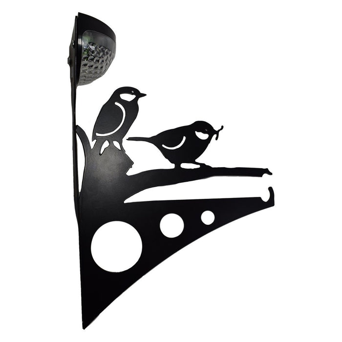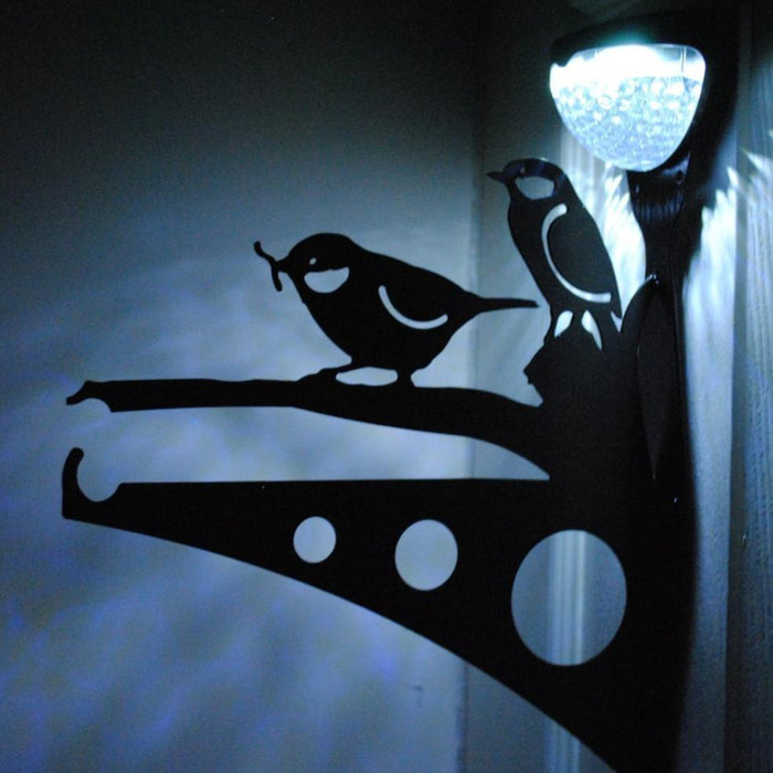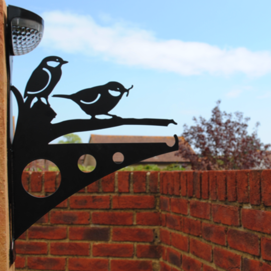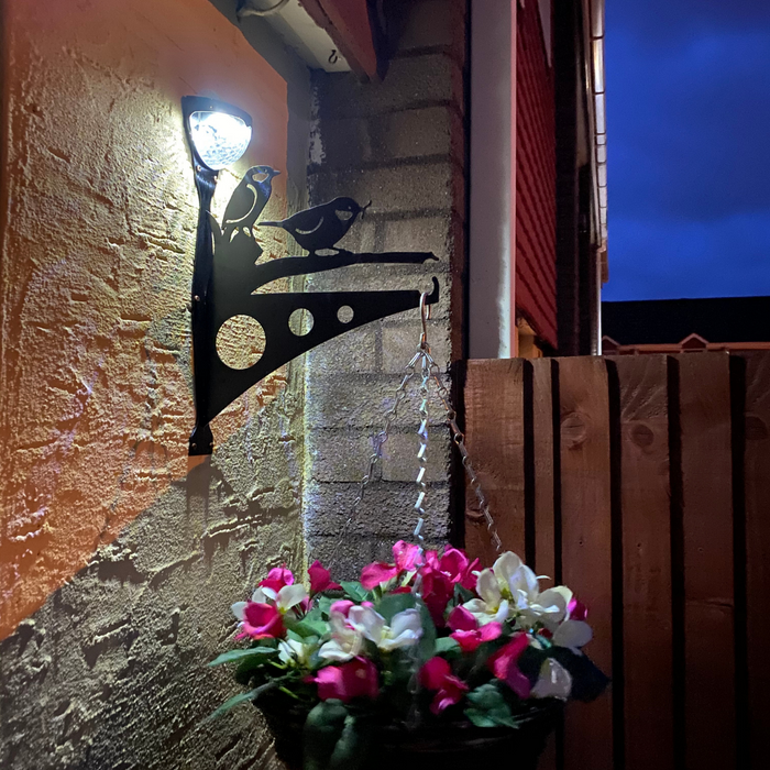This beautiful, bespoke designed steel bracket features 2 birds on a branch. The bracket also includes a powerful solar-powered LED light.