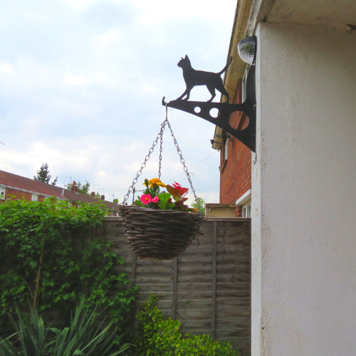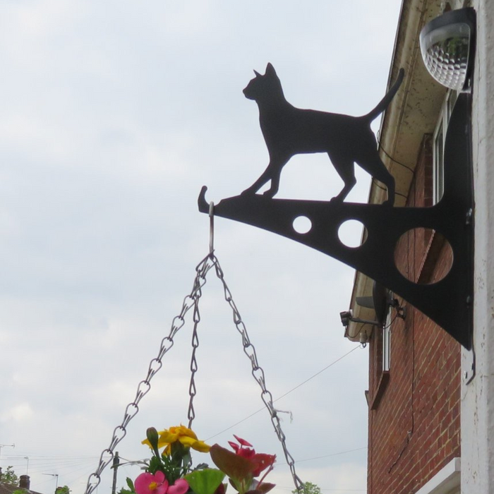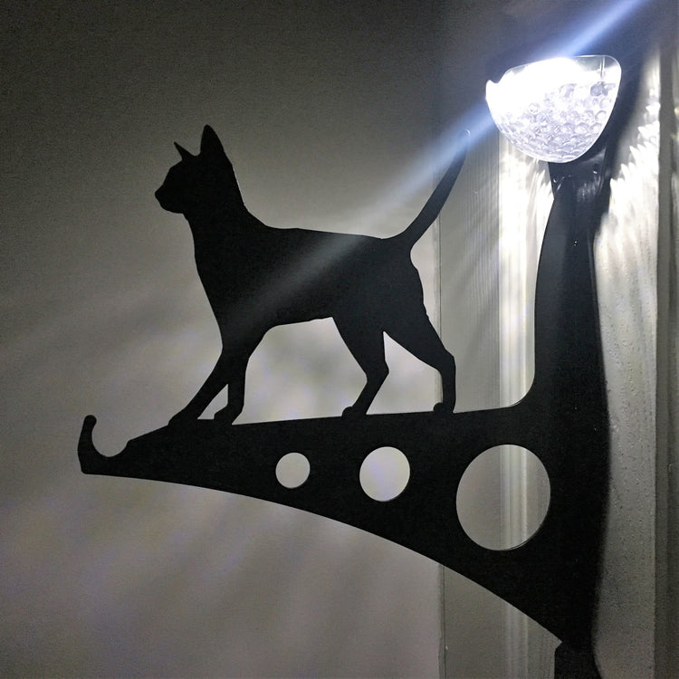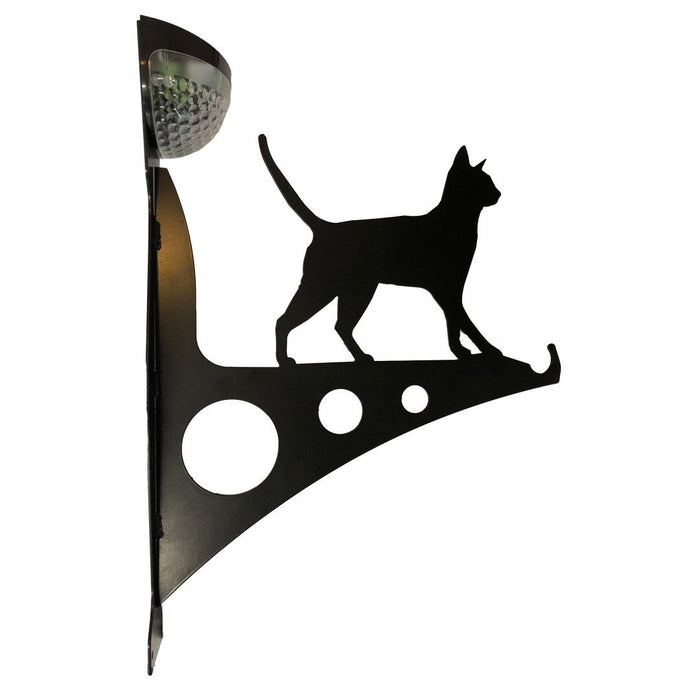 A bespoke steel bracket of an inquisitive cat. The bracket also includes a powerful solar-powered LED light - a perfect addition to light up the garden.
