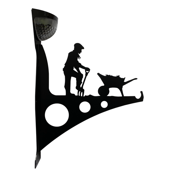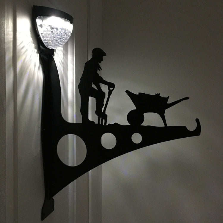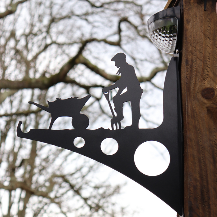 A bespoke steel bracket of a man doing his gardening. The bracket also includes a powerful solar-powered LED light - a perfect addition to light up the garden.