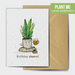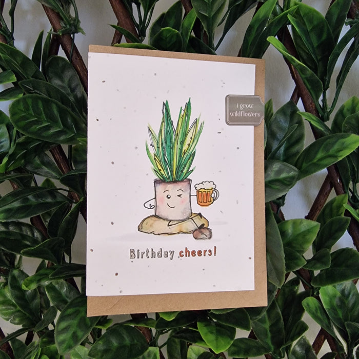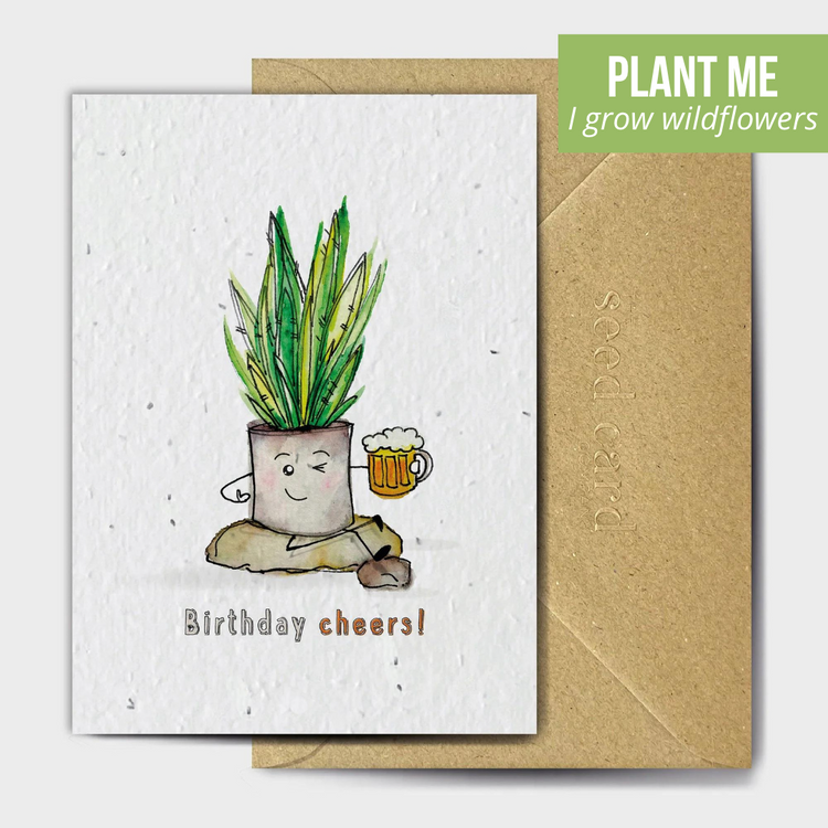 An illustrated card with a plant character raising a glass of beer with a beautiful splash of watercolour perfect to say Happy Birthday to any beer lover! 🍻