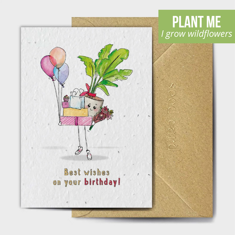 An illustrated card with a plant character bringing Happy Birthday wishes (and gifts of course 🤣)